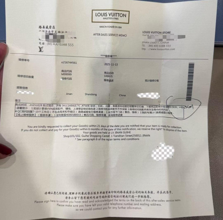 侯女士提供的聊天截图侯女士告诉记者,11月12日,她的家东谈主初次衣服该外衣外出时,被旁东谈主指示“衣襟不合称、拉链合座向右偏移”。侯女士合计这影响了衣服成果,属于质地问题。于是次日,她带着衣服和购买根据,回到该LV专柜条目换货。专柜责任主谈主员秉承了外衣,并开具维修登记单,见告她需将商品寄回总部进行核定。